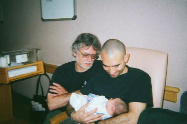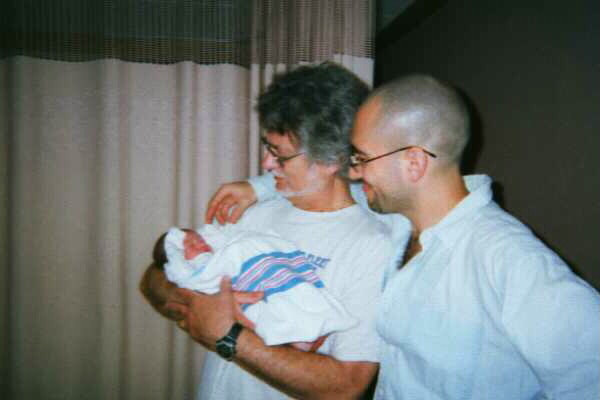 Born 10:23 a.m. Sunday July 20, 2003 at New York University Medical Center. 7 pounds 4.8 ounces. Mom and baby both doing fine. Nancy and I grabbed a 9:22 a.m. train to New York, so we were still on the train when he was born, but thanks to cell phones we were able to talk with the great-grandparents and find out all the news while we were traveling. Got to Penn Station, started walking along 33rd Street toward 1st Ave (location of NYU hospital)... in a few blocks a college kid carrying a skateboard said "hi" to us and we realized we'd met up with Adam's half-brother, also on his way to the hospital. (Small world and all that.... I mean, we were almost a mile from the hospital.) Enough chit-chat... here's a picture... Three generations...