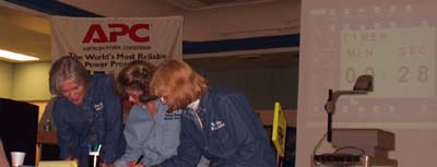 This was a team competition with thirty-nine teams of three people each. The teams were sponsored -- $150 entry fee -- some by businesses, some by individuals, some by groups or just by passing the hat around. Nancy was on the team from her school (pictured above -- that's Nancy on the right with the music/band teacher on the left and the principal in the middle), financed by passing an envelope around the faculty room. There were teams from each public school in town, at least one private school, two car dealerships, a real estate office, three members of the town council, three school board members, three pediatricians from a medical group, three teenagers from the high school, etc. The teams were divided into three "hives" of three teams each for the first round. Teams that survived the first round went on to compete in the second round. After the first round, if a team knew they could not spell the word, they could raise a "BEE-fuddled" sign and see if anyone in the audience would donate ten dollars for the chance to spell the word for them. Also, if a team lost a round, they could move on to the next round anyway if an audience member was willing to donate twenty-five dollars to resuscitate them. The evening had started at six p.m. in the high school cafeteria with a "BEE-stro" where local restaurants donated food (mmmm, some good stuff!) The spellers were admitted free, but everyone else paid five dollars admission (which included both the food and the spelling bee). There were a lot of family and friends of the competitors in attendance -- the cafeteria was full. The competition was judged by two "celebrity" judges: the superintendent of the local school system and Judith Dupre (author of Skyscrapers and Churches and Bridges, etc.) Needless to say, the emphasis was more on having fun (and raising money) than on what you might expect from a spelling bee. The words ranged from somewhat easy (although potentially tricky) such as carburetor to obscure, such as Dinoflagellata (an order of tiny ocean-dwelling life forms), with some Rhode Island place names thrown in (such as Pettaquamscutt and Quonochontaug). Eventually, Nancy's team lost.