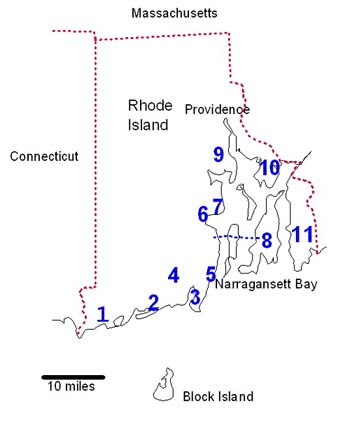 Someone left a comment for yesterday's Block Island entry... wondering just where Block Island was located and was I talking about Rhode Island. I guess regular readers know these entries come to you from the smallest state, but I suppose somebody who just popped in might wonder where the action is located... so I though I'd provide a quick Rhode Island geographic reference guide.