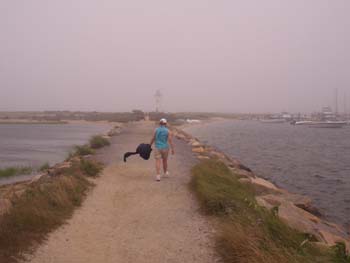 Wind and fog -- Nancy is walking toward the lighthouse. She is holding