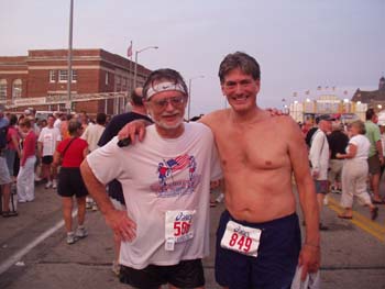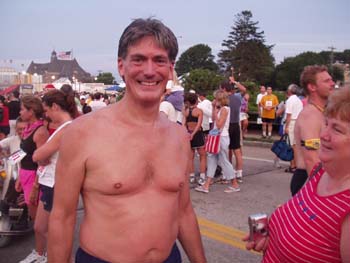 So my brother Charlie and I ran the Blessing of the Fleet 10 mile run a week ago Friday and had a great time doing it. There were 2141 runners who successfully completed the ten miles (and we were among them) along with 516 walkers (who cover the same course but who start an hour before the runners). With that many runners starting on a narrow village road, it takes some time just to get to the starting line (at a shuffling pace) and quite a distance before the crowd of runners is spread out enough for there to be room. My brother was having leg cramps about a mile into the race that made us have to stop a few times so he could stretch them and attempt to knead the cramp away, but as there got to be more room we were able to hit a better pace and his muscle cramps went away. (He has been doing relatively little running as he is busy ramping up his bicycle mileage in preparation for doing that 105 mile bike ride across Death Valley again this fall.) We clowned around during the race, laughing and joking, applauding the spectators, announcing that we represented a combined total of 120 years of experience and trickery. Charlie was quite fond of selecting a spectator who appeared to be in our age group, reaching out for a quick high five or handshake and calling out to them as if he knew them "Hi, wow, great to see you again, man, it's been ages, bye!" -- leaving them with a puzzled look as they searched their memories, trying to figure out who it was that had said hello to them. This is a very enjoyable race to run in -- great traffic control, lots of water available along the course, and more spectators per mile than any other race I've ever run. There was a woman bagpiper playing in the front yard of a house somewhere in the first mile of the race. The course passes back through that neighborhood around eight miles into the run and there was a section where there traffic barriers with ropes to provide a clear path for the runners through the crowd of spectators -- and there was that bagpiper playing Irish music. Charlie turned to me and said "When we get up by her, let's stop and dance a jig." Well, we stopped and, although I could not get my tired legs to do more than a semi-Celtic shuffle (but I am not a very good dancer in the best of circumstances, except perhaps dancing the twist), Charlie (who is an outstanding dancer) did a fair little jig. This made things difficult for the piper who was attempting to fight back laughter while playing. (It can't be easy to play the bagpipe while laughing.) As we resumed running, one bystander called out "You have entirely too much energy for this far into a race!" Well, not quite... we were both very tired... but we wouldn't let that interfere with having fun.