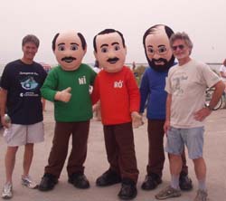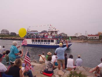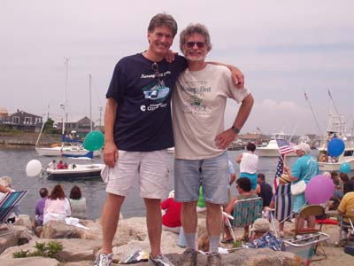 The State Police boat was carrying R.I. Governor Don Carcieri, who waved to the crowd as he passed by (and then docked a bit further along so he could come back and join the local officials on the reviewing stand). I was interested to note that people paid almost no attention to him at all -- a few waved to him, but people were waving at every boat. That's pretty much a reflection of the reality of state government in Rhode Island -- the leaders of the legislature have far more power than the governor -- in addition to which the Democrats have about 85% of the seats in the legislature and the Republicans hate each other so much that half of them are demanding to have their offices moved because they can't even stand to have offices near to their fellow Republicans. (This really is a peculiar little state.) Well, that's it for the Blessing of the Fleet 2005. Let me leave you with one more picture of the Lawrence brothers...