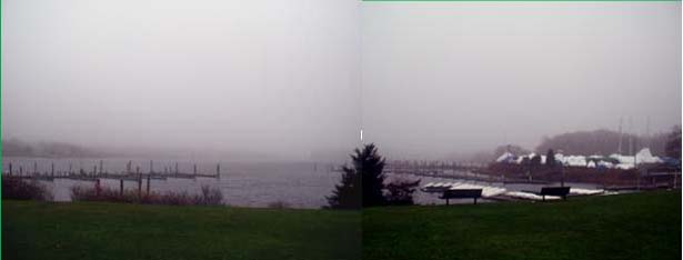 Okay, I know that the temperatures are going to be dropping and in a couple of days we will have seasonable cold and a storm bringing us a mixture of rain and snow... but in the meanwhile, after a day of very interesting weather, we've just enjoyed a day with mild temperatures, blue skies, and bright sunshine. Here's a picture of yesterday -- foggy -- very foggy. Yesterday started out mild but wet and foggy and then continued foggy. I went into town around lunchtime to get a gallon of milk and a few odds and ends and went a few blocks out of my way to take this picture of Point Judith Pond. Actually, as you can probably tell, this is really two pictures that I have somewhat ineptly cropped and merged together (I hadn't intended on making a panorama but when I pulled the pictures onto the computer I thought that it would be interesting to try to combine two of them.) Oh... a "pond" in Rhode Island can mean a body of salt water that is mostly surrounded by land -- the opposite end of Point Judith Pond from where I took these pictures is where the Block Island ferries come in to dock at Galilee. (There are some pictures taken at the open end of Point Judith Pond in this entry about the Blessing of the Fleet.) Let's see, if I've done this right, this will link to a Google satellite picture of Point Judith Pond-- the fog pictures were taken at the northern end (facing south) just a bit south of that highway and the Blessing of the Fleet pictures were taken down by the narrow opening. Hey, that really works! This is so cool. Here is a close up view of where I was standing when I took the pictures.