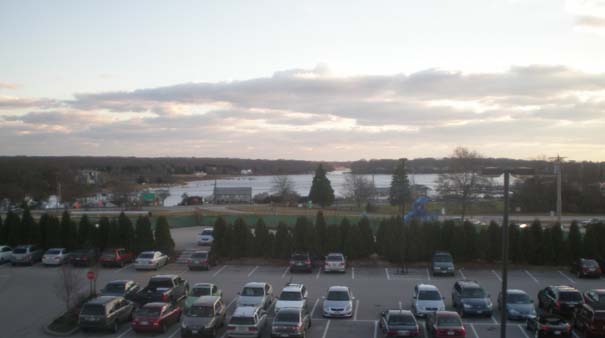 On my way out of the office (3rd floor of a medical office building attached to our local hospital), I glanced out the window and was struck by the view of Point Judith Pond. Almost three and a half years I've been coming to this medical office and I had never stopped to realize what a good water view they had. One foggy early December day in 2006 I had snapped a picture of the same area, except I took it from a spot much closer to the water. (I probably should note that people around this area use "pond" for a body of water that other places might call an inlet or a lake. Point Judith Pond is more than three miles long.)
