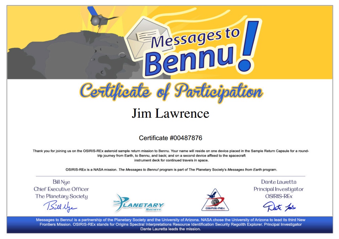 Certificate of Participation for the Bennu space mission.